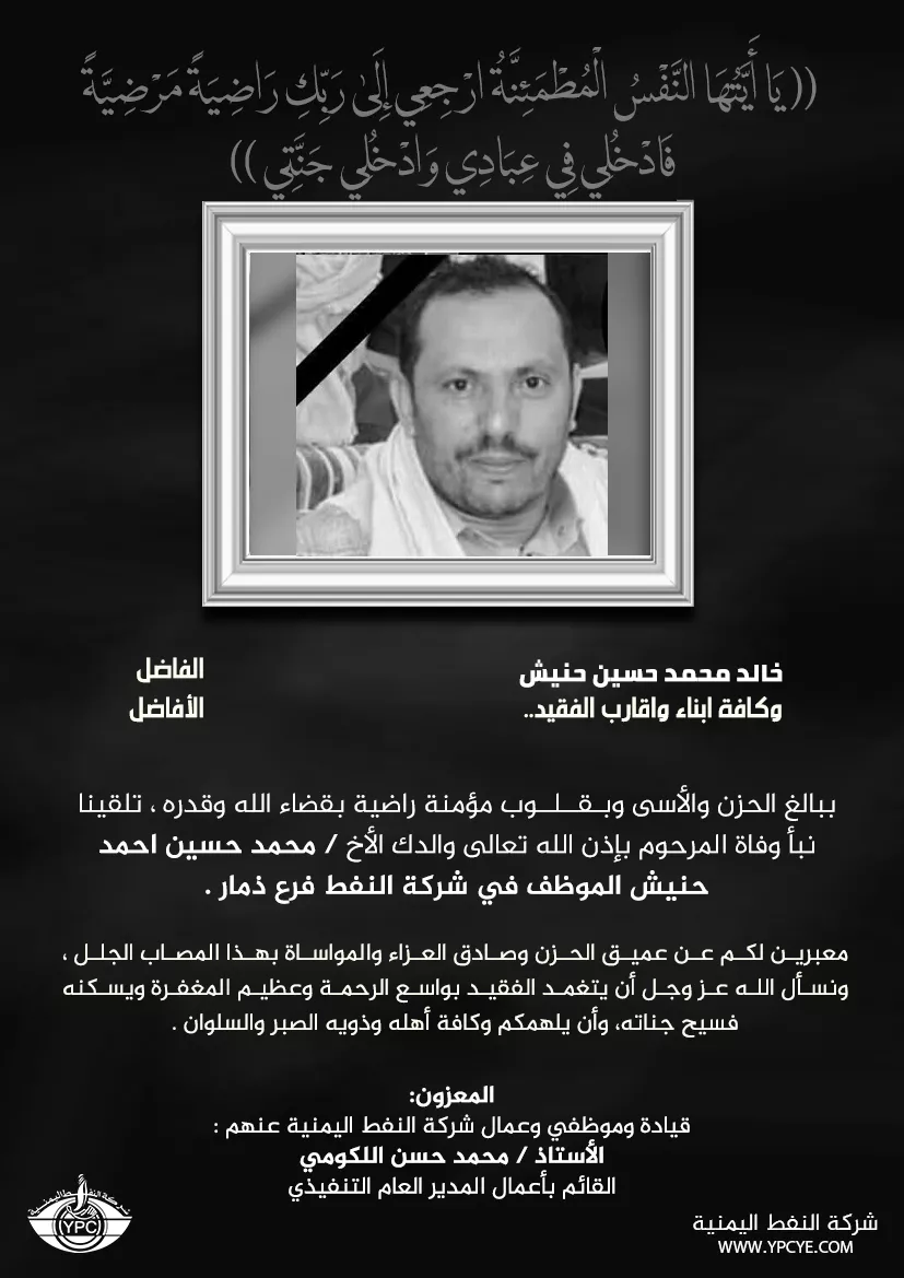 ببالغ الحزن والأسى وبـقــلــوب مؤمنة راضية بقضاء الله وقدره ، تلقينا نبأ وفاة المرحوم بإذن الله تعالى والدك الأخ / محمد حسين احمد حنيش الموظف في شركة النفط فرع ذمار .